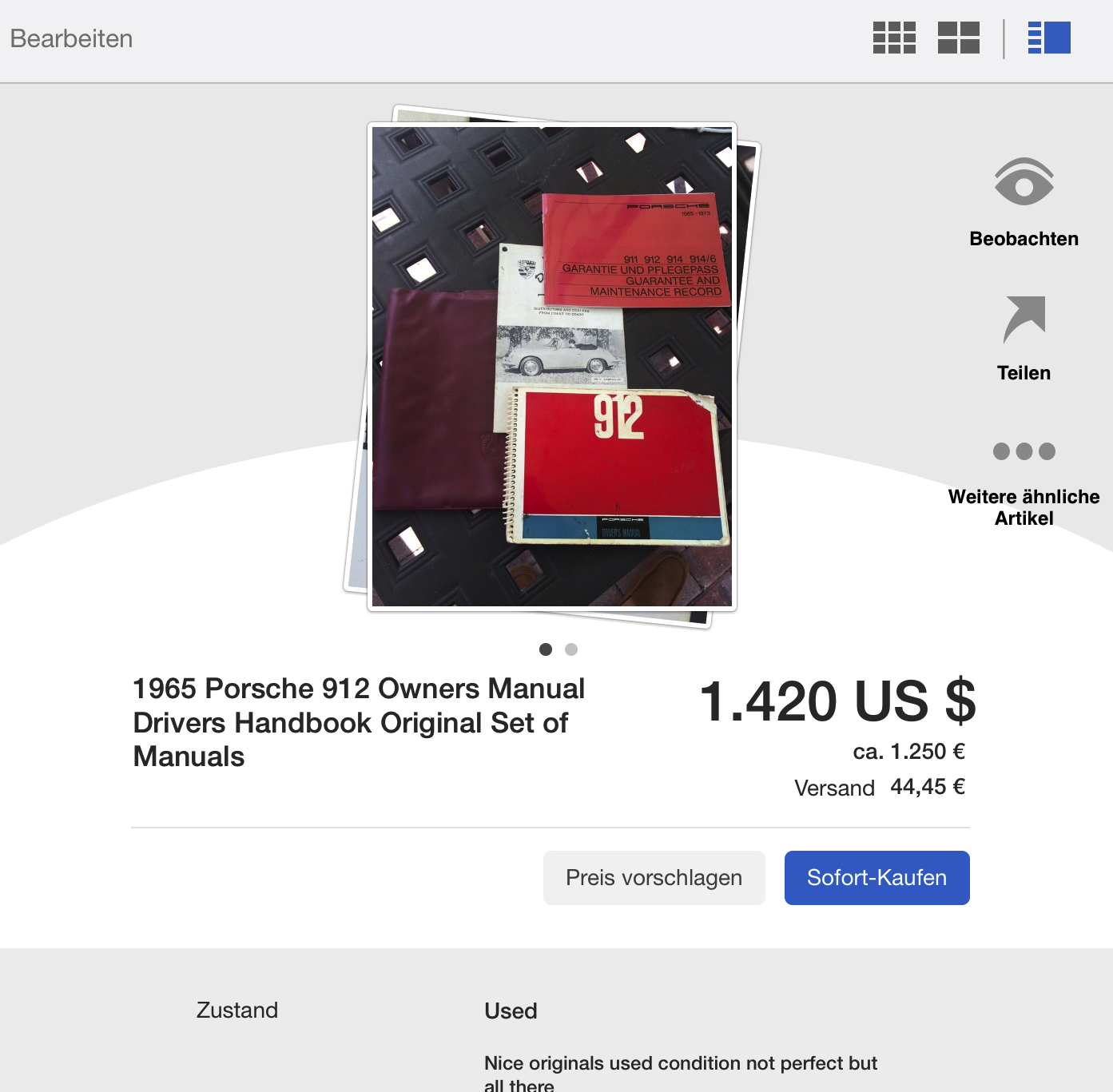 Also dass ist es mir wirklich nicht wert. Da war die Bedienungsanleitung meines Freundes ja ein echtes Schnäppchen. Aber die ist auch ein Nachdruck und kein Original. Hier liegt der kleine aber feine Unterschied. Die alten Bedienungsanleitungen aus 1965 und 66 werden nicht nachgedruckt. Im Gegensatz zu den Bedienungsanleitungen ab 1967, die es sogar im Porsche Classic Shop zu kaufen gibt…